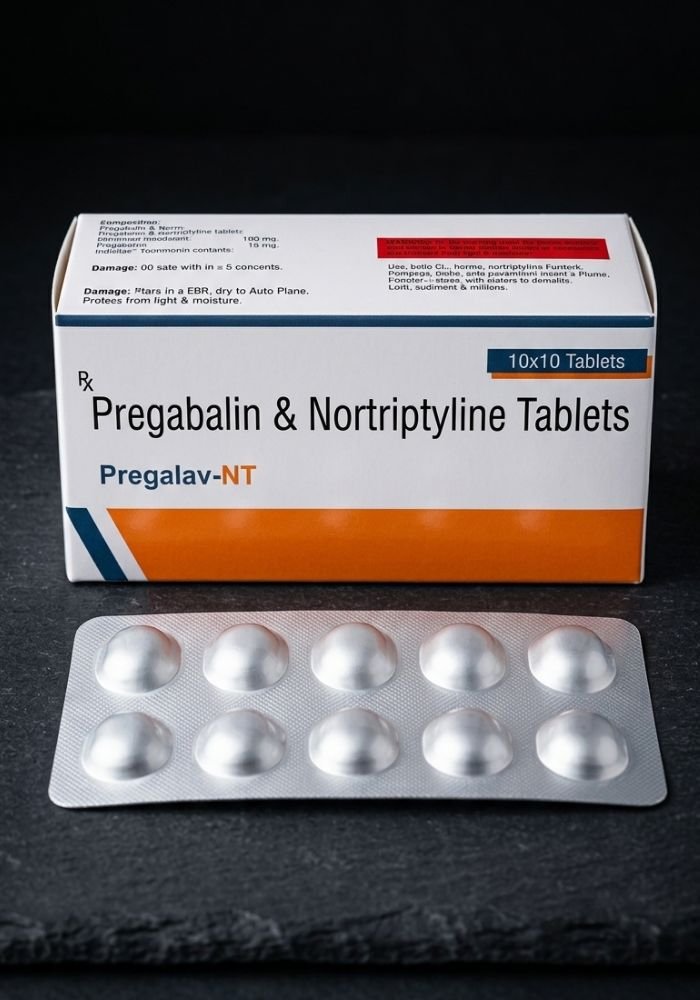 Pregalav-NT combines two powerful healing salts: Pregabalin 75mg and Nortriptyline 10mg. Pregabalin works wonderfully by calming down hyperactive and irritated nerves. Nortriptyline actively stops unnecessary pain signals from reaching brain centers. Together, they provide deep, long-lasting relief from burning sensations, numbness, and sudden sharp pain. Dual-Action Formula combining two effective ingredients for nerve pain relief.